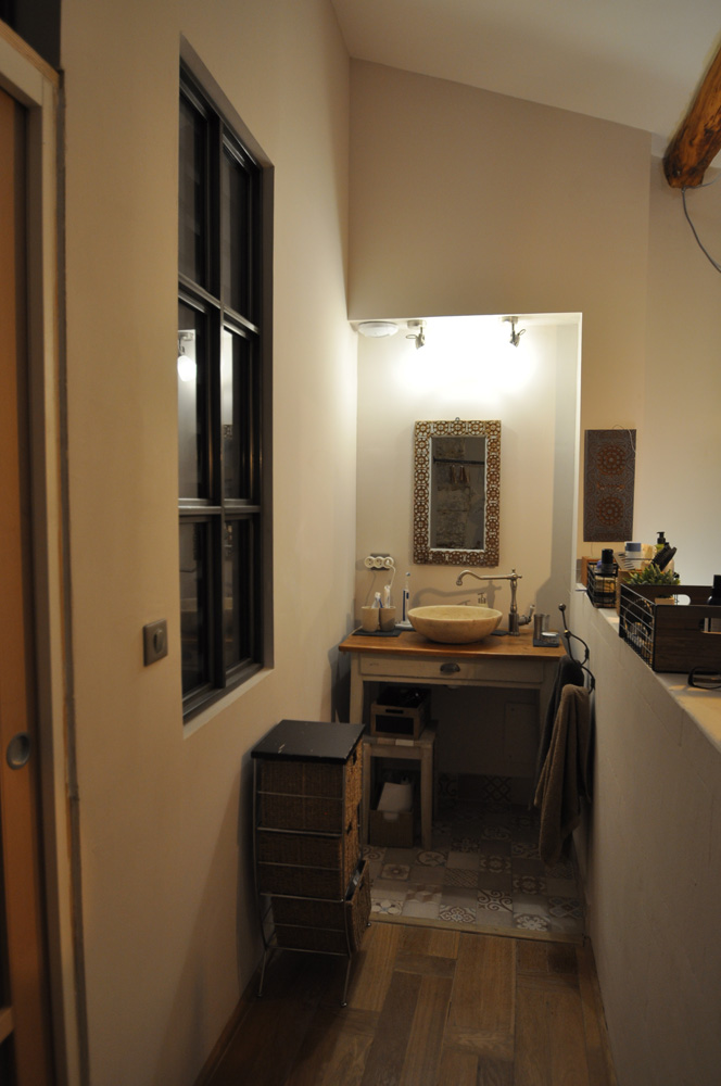 Anne Immediately understood my desire for achieveing the maximum among of natural light on this floor. So she proposed to leaded glass windows on either side of the bathroom, the space that separates the Telework office on one side and the bedroom on the other.