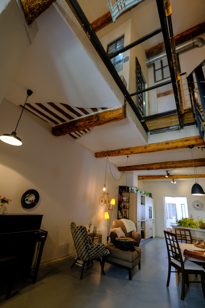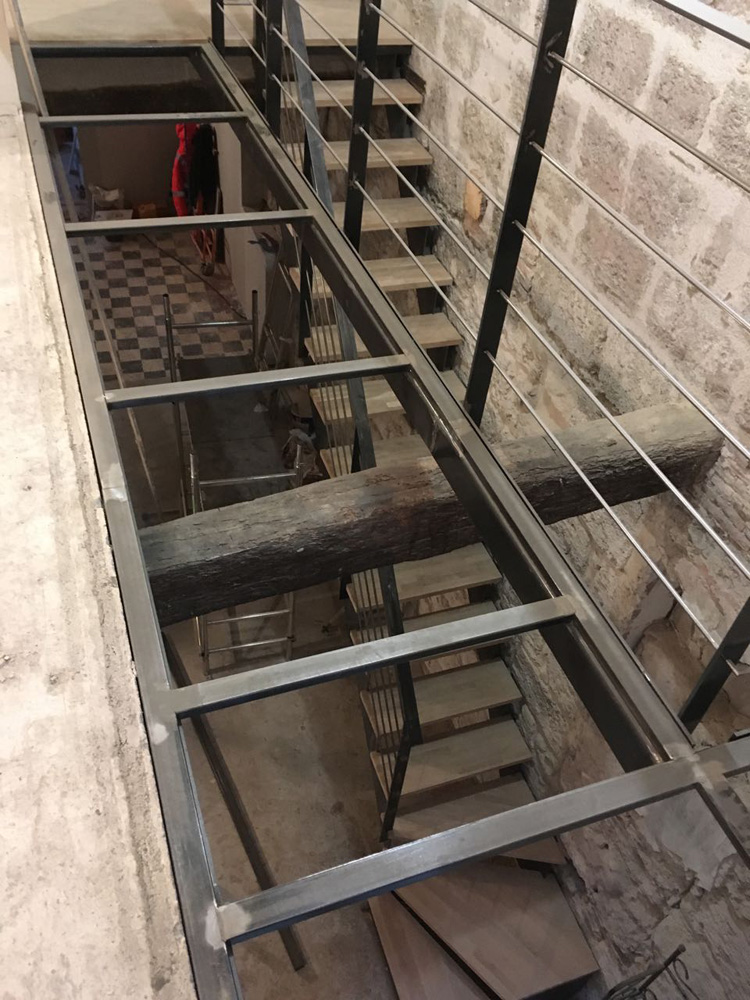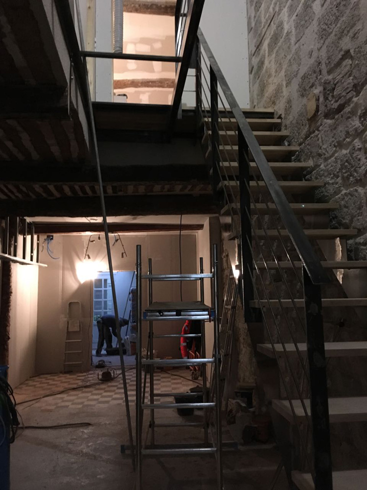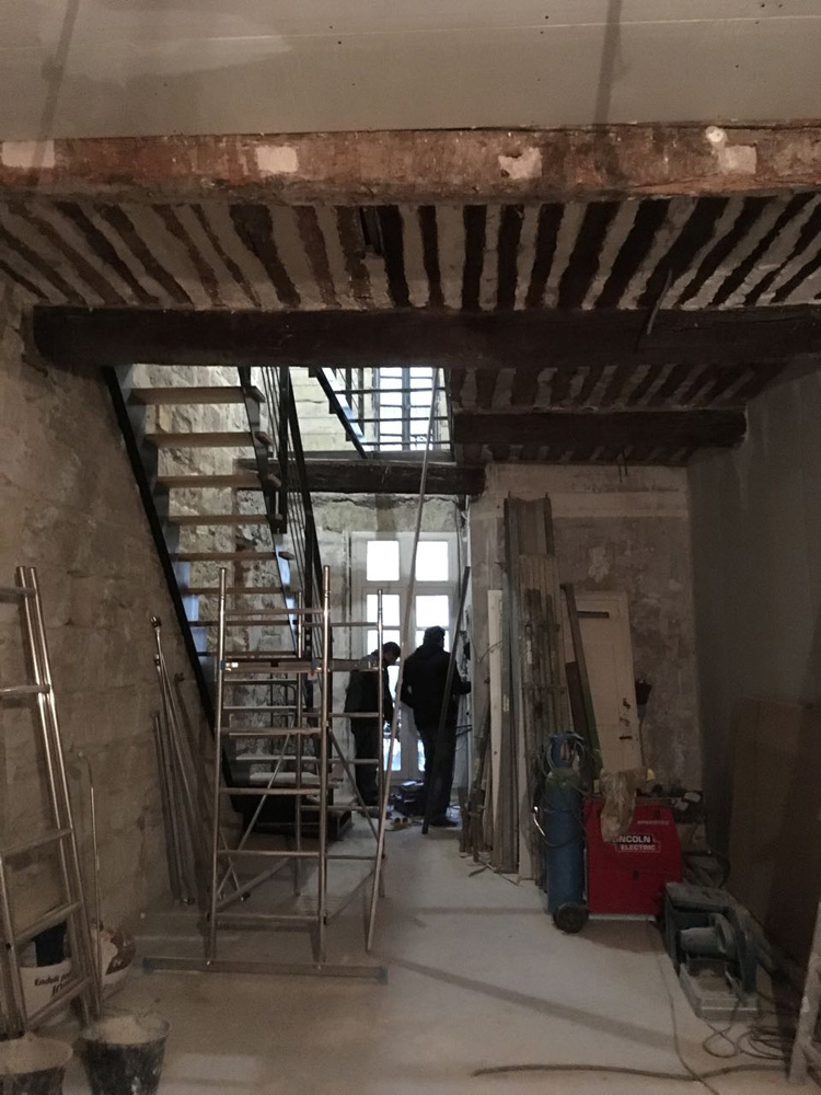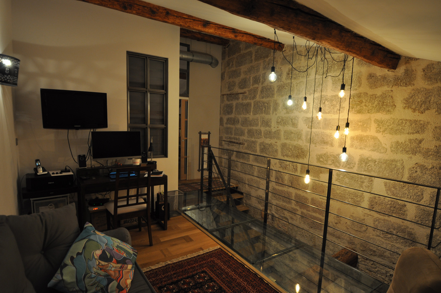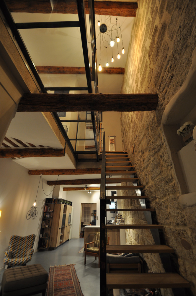 Next we took out the old wall separating the living from the kitchen and replaced the former kitchen with a custom made “Loft Kitchen” design from Eric Hanriot’s kitchen design studio in town. Ian painstakingly revealed the former wooden beamed “French ceiling” in one corner. The mind’s eye can imagine the rest of it in the same form. The new industrial floor is a dream to wheel a suitcase over. Laurent a local tiling expert turned wood and steel connoisseur single handedly constructed Anne’s concept stairs and a glass floor “passerelle” that I had first seen in a French home déco magazine. Laurent also built the wood and iron “air dressing” on the 3rd floor.