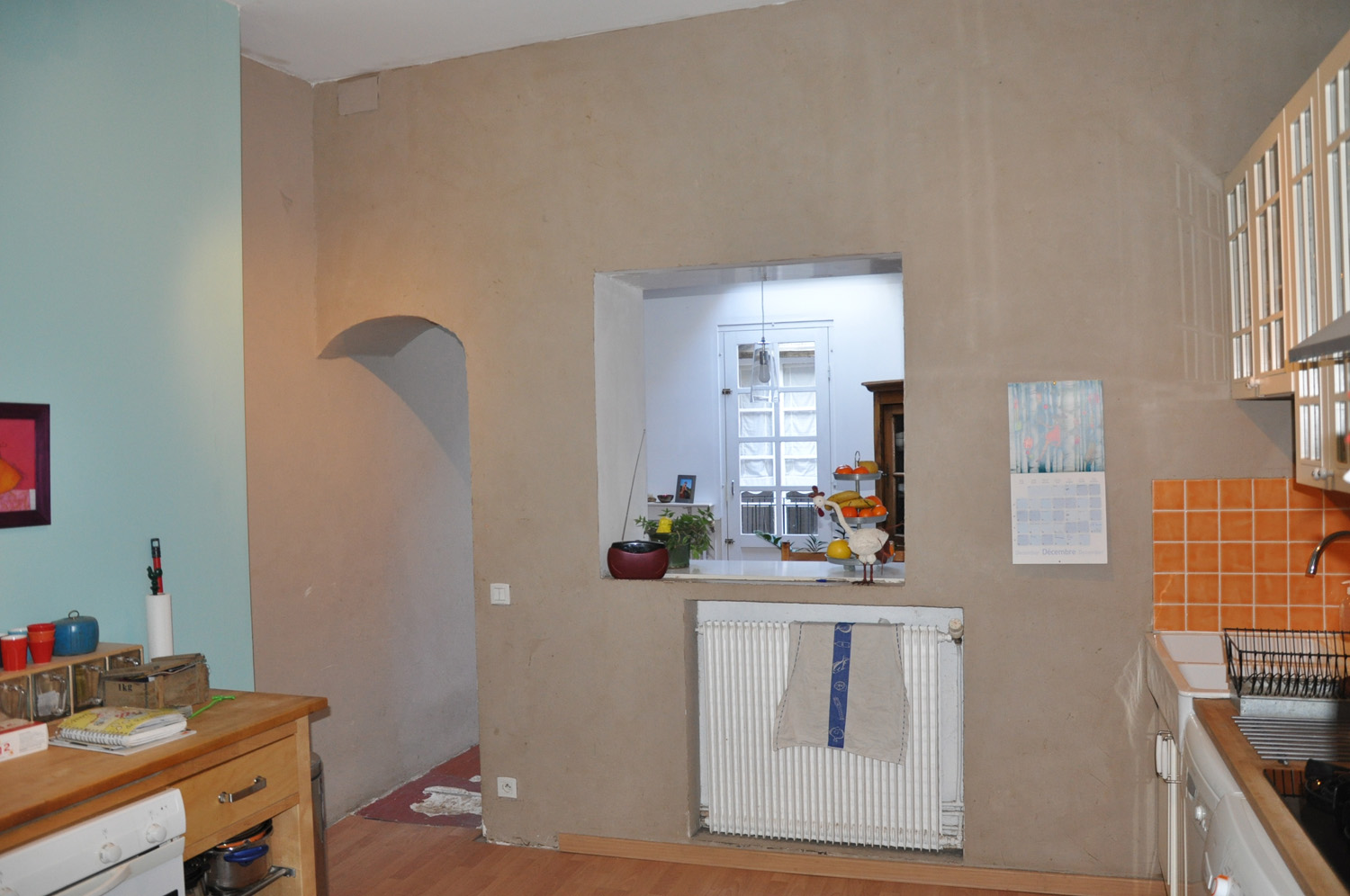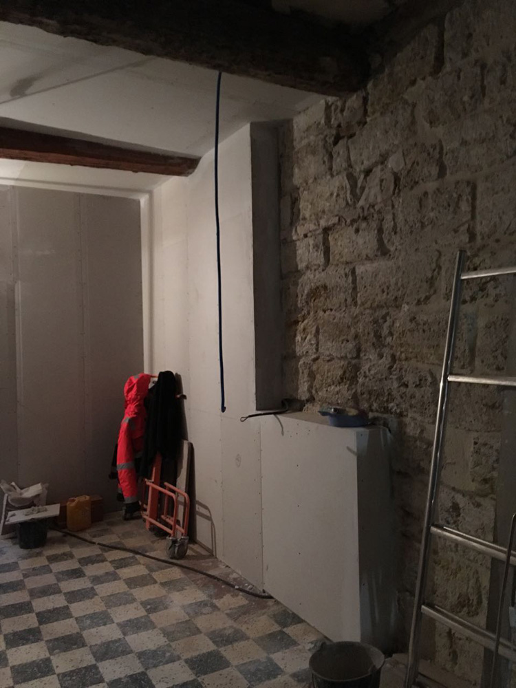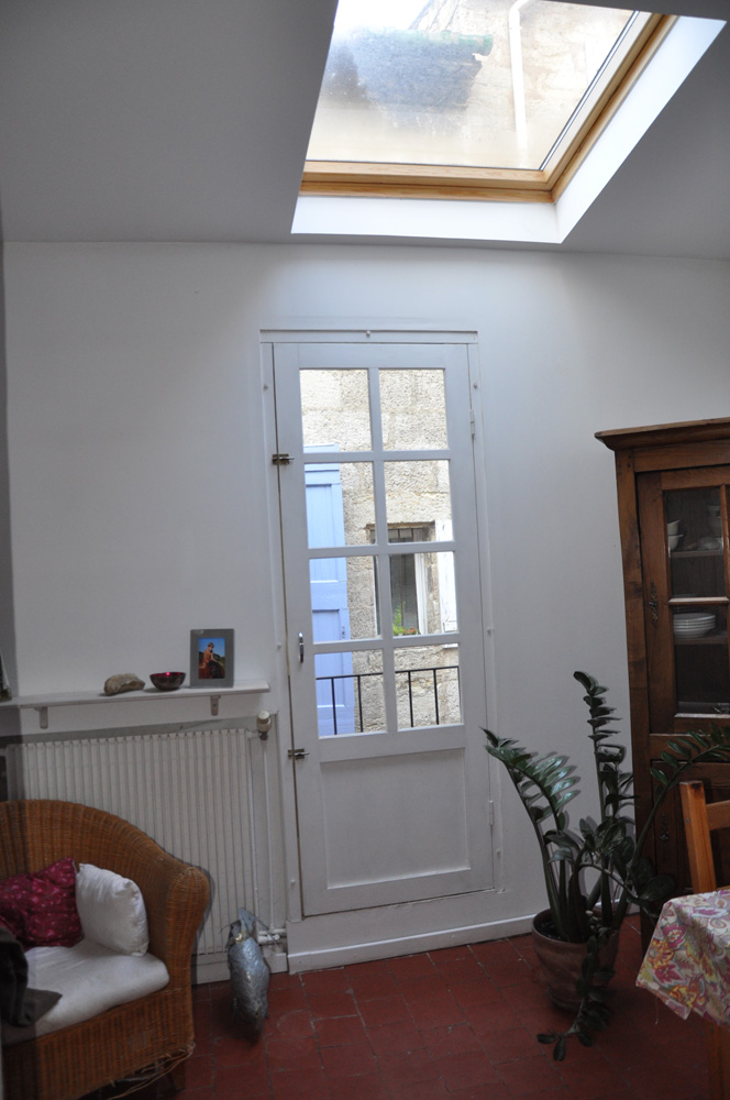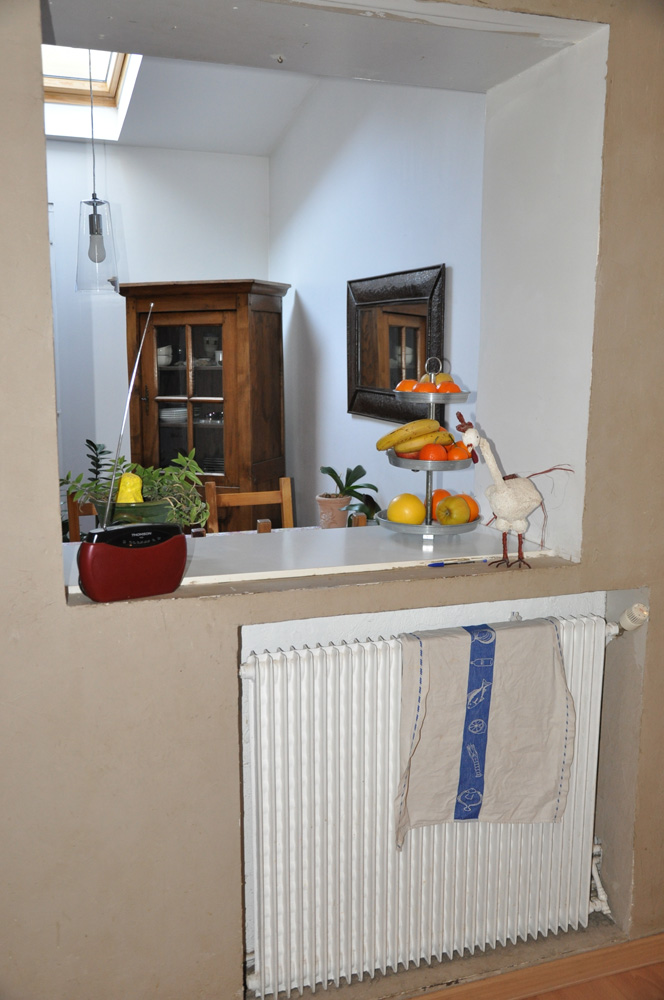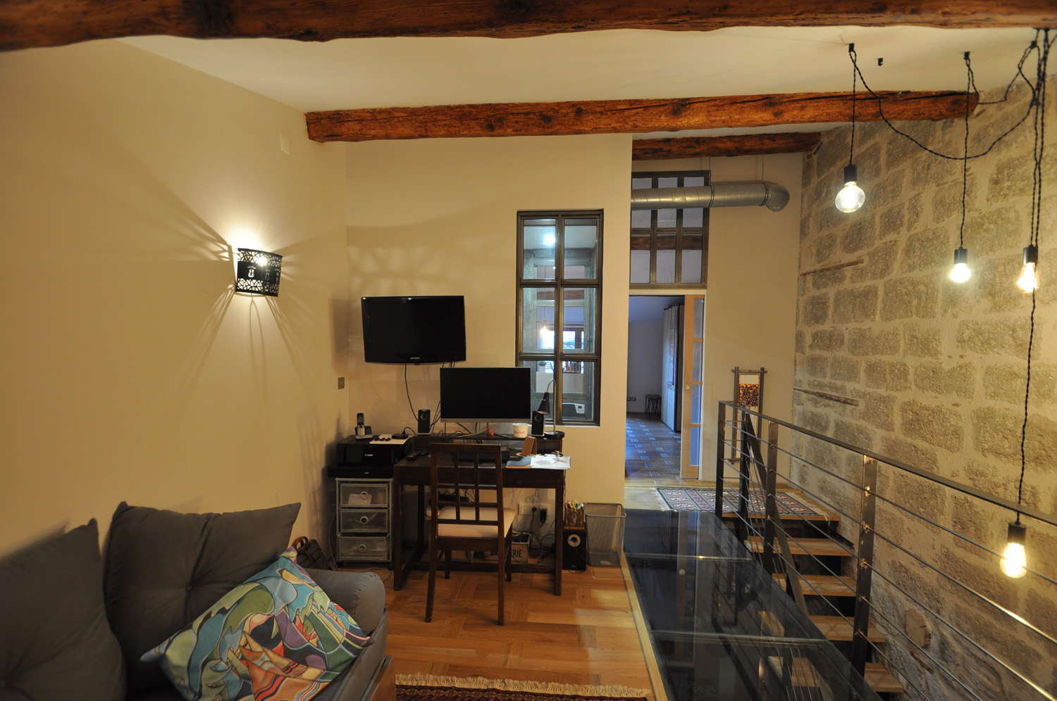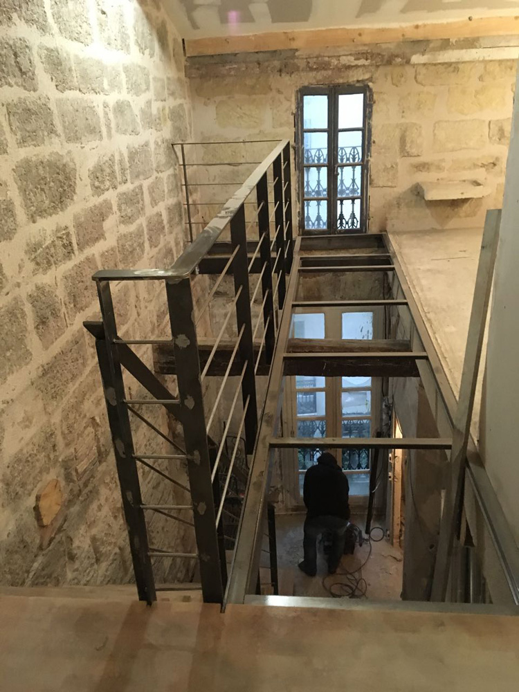 Next we took out the old wall separating the living from the kitchen and replaced the former kitchen with a custom made “Loft Kitchen” design from Eric Hanriot’s kitchen design studio in town. Ian painstakingly revealed the former wooden beamed “French ceiling” in one corner. The mind’s eye can imagine the rest of it in the same form. The new industrial floor is a dream to wheel a suitcase over. Laurent a local tiling expert turned wood and steel connoisseur single handedly constructed Anne’s concept stairs and a glass floor “passerelle” that I had first seen in a French home déco magazine. Laurent also built the wood and iron “air dressing” on the 3rd floor.
