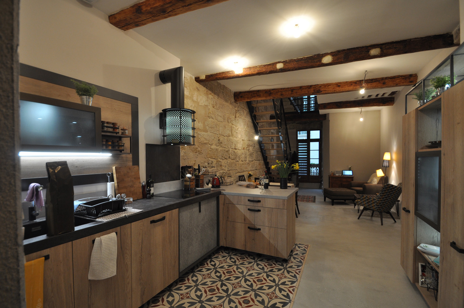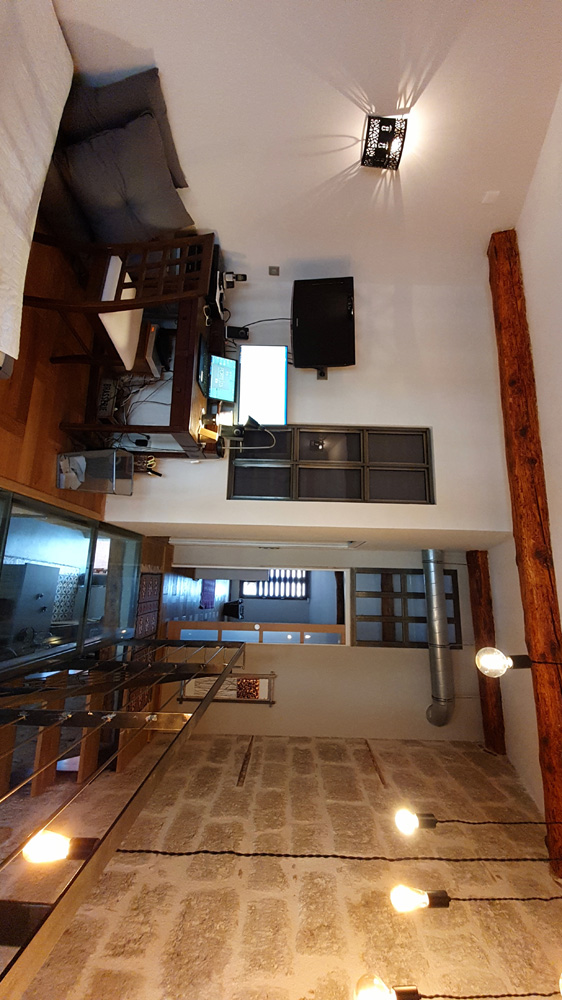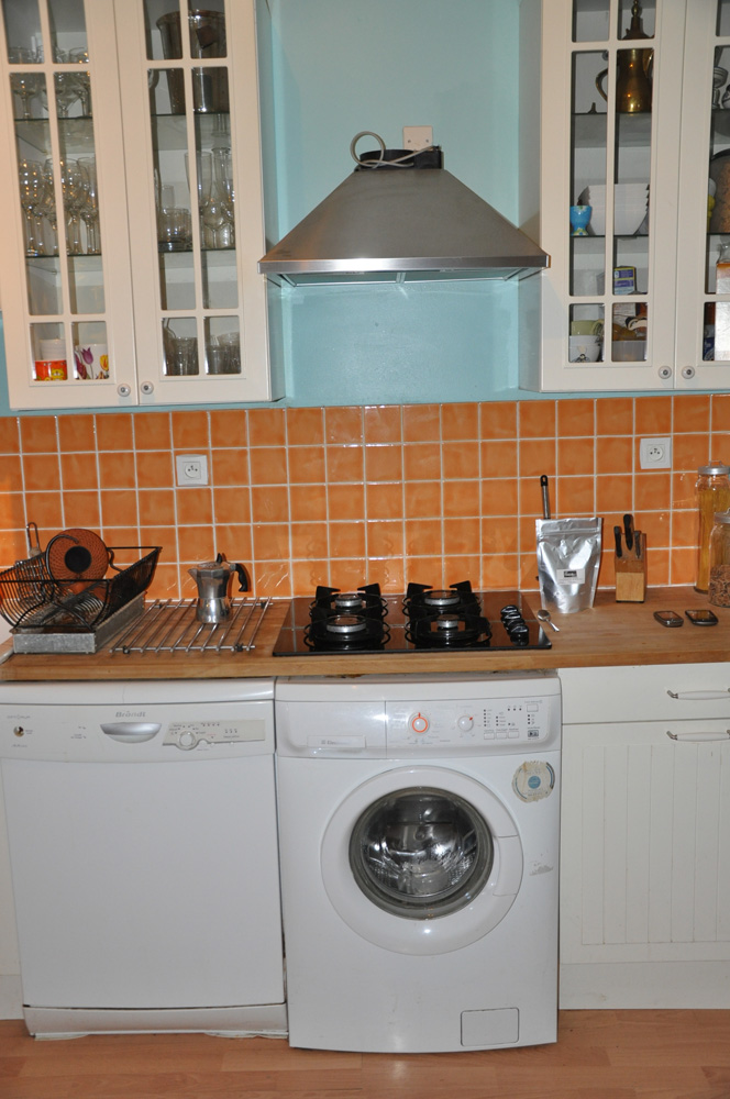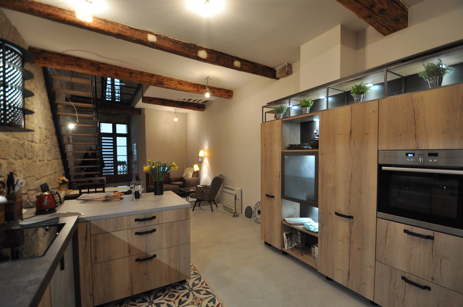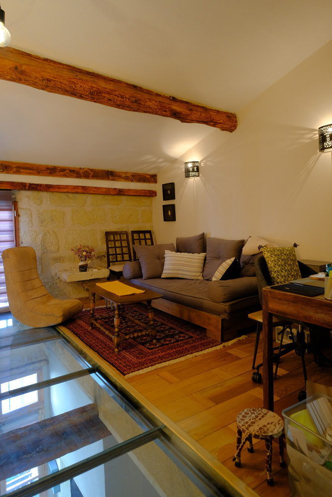 Next we took out the old wall separating the living from the kitchen and replaced the former kitchen with a custom made “Loft Kitchen” design from Eric Hanriot’s kitchen design studio in town. Ian painstakingly revealed the former wooden beamed “French ceiling” in one corner. The mind’s eye can imagine the rest of it in the same form. The new industrial floor is a dream to wheel a suitcase over. Laurent a local tiling expert turned wood and steel connoisseur single handedly constructed Anne’s concept stairs and a glass floor “passerelle” that I had first seen in a French home déco magazine. Laurent also built the wood and iron “air dressing” on the 3rd floor.