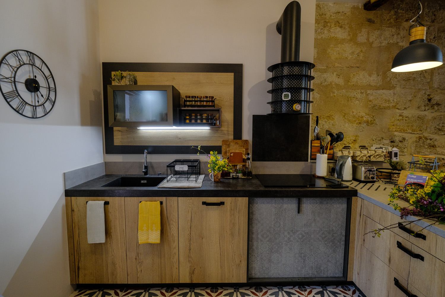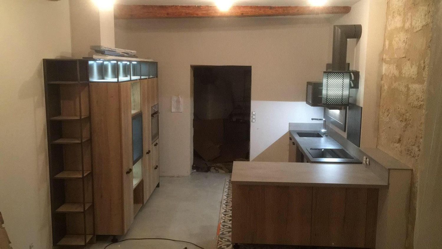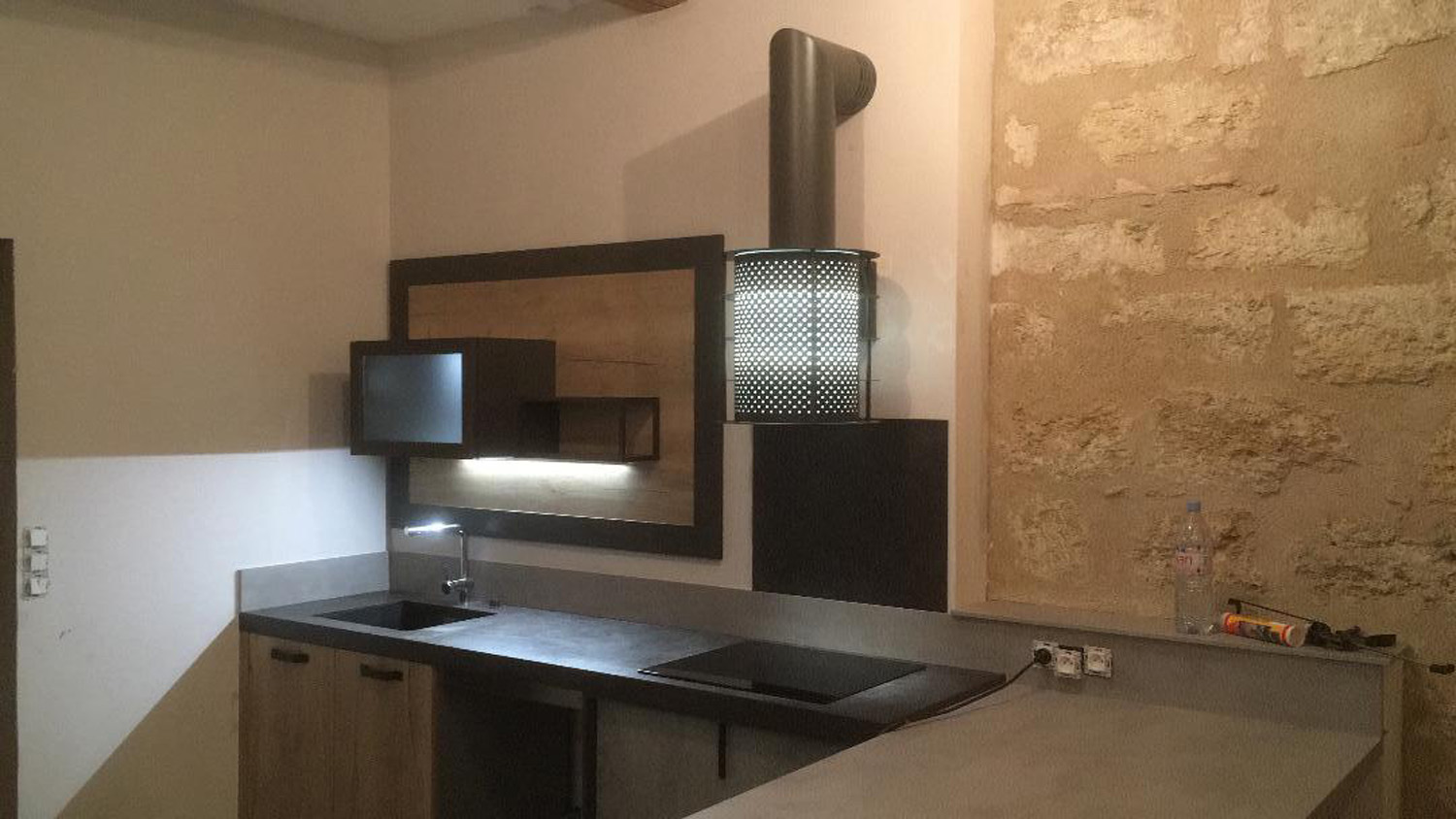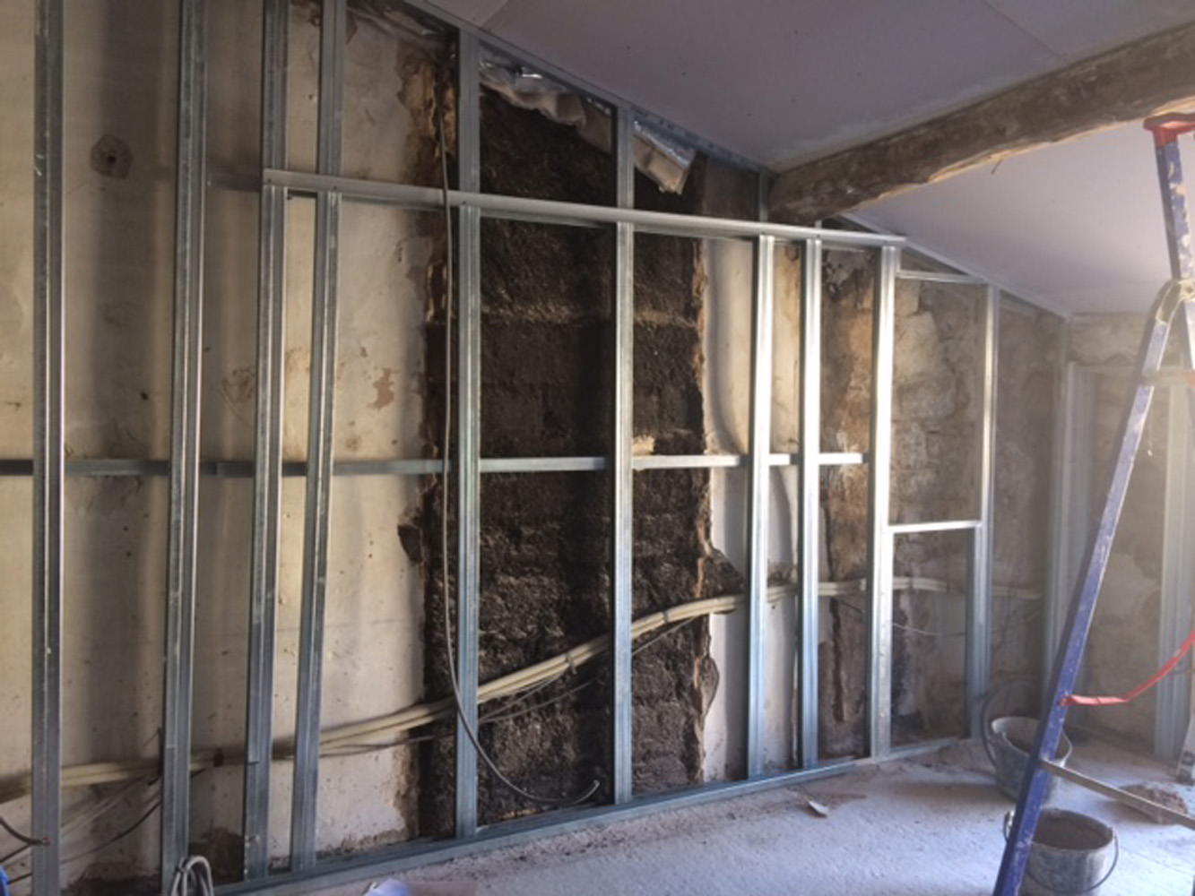 Next we took out the old wall separating the living from the kitchen and replaced the former kitchen with a custom made “Loft Kitchen” design from Eric Hanriot’s kitchen design studio in town. Ian painstakingly revealed the former wooden beamed “French ceiling” in one corner. The mind’s eye can imagine the rest of it in the same form. The new industrial floor is a dream to wheel a suitcase over. Laurent a local tiling expert turned wood and steel connoisseur single handedly constructed Anne’s concept stairs and a glass floor “passerelle” that I had first seen in a French home déco magazine. Laurent also built the wood and iron “air dressing” on the 3rd floor.