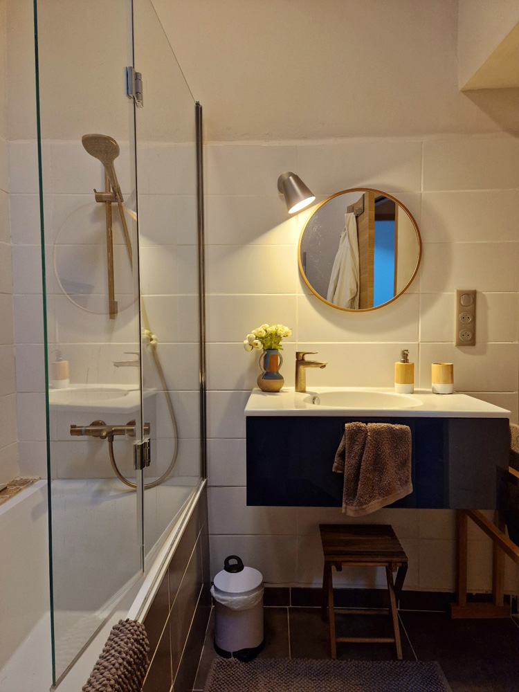 Laurent’s “air dressing” also inspired by a magazine spread pairs beautifully with his stairway masterpiece and the leftover floor tiles Ian laid for us. I wanted to incorporate a bit of the Paris Pompidou centre with a warehouse loft feel to it, so the evacuation air pipe is visible from one end to the other. The leaded glass on either side of the bathroom were a perfect choice from Anne.