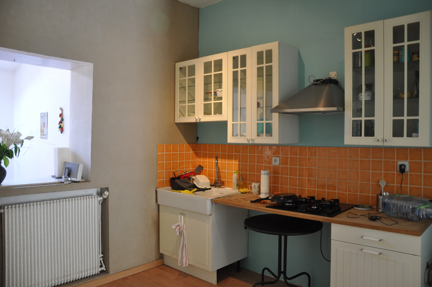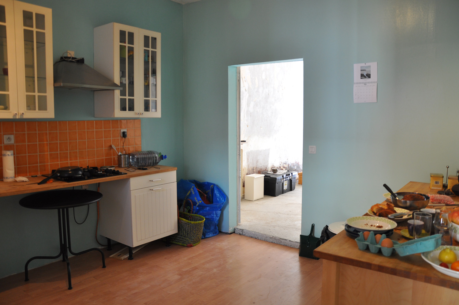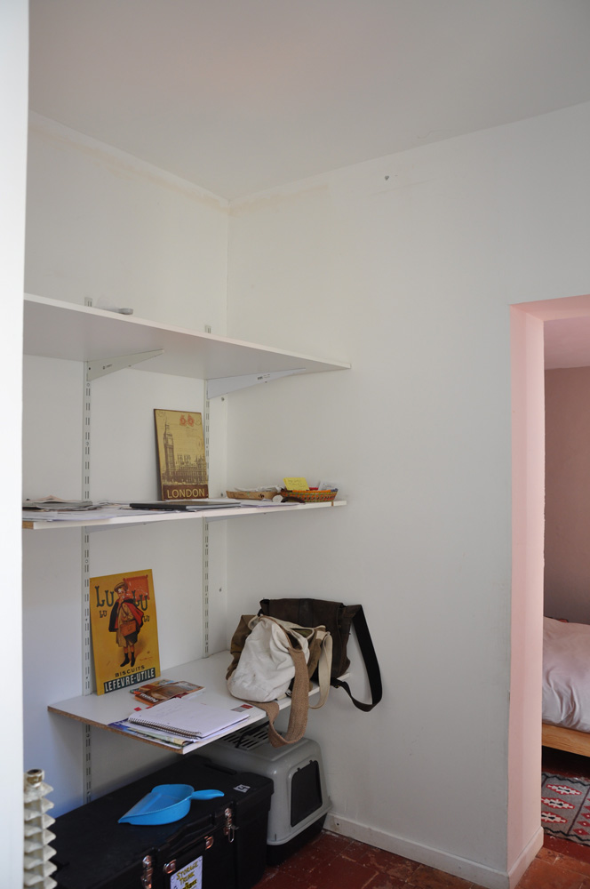 Formerly the previous owners’ dining room, this space always felt like the future heart of the floor with its (formally unauthorisd) velux window. We turned the opening previously between the kitchen and dining room into a full door; and sealed the previous doorway into a nest of wooden shelves. Result: a reading / writing / tea and breakfast room, filled with natural light and inspiring déco.