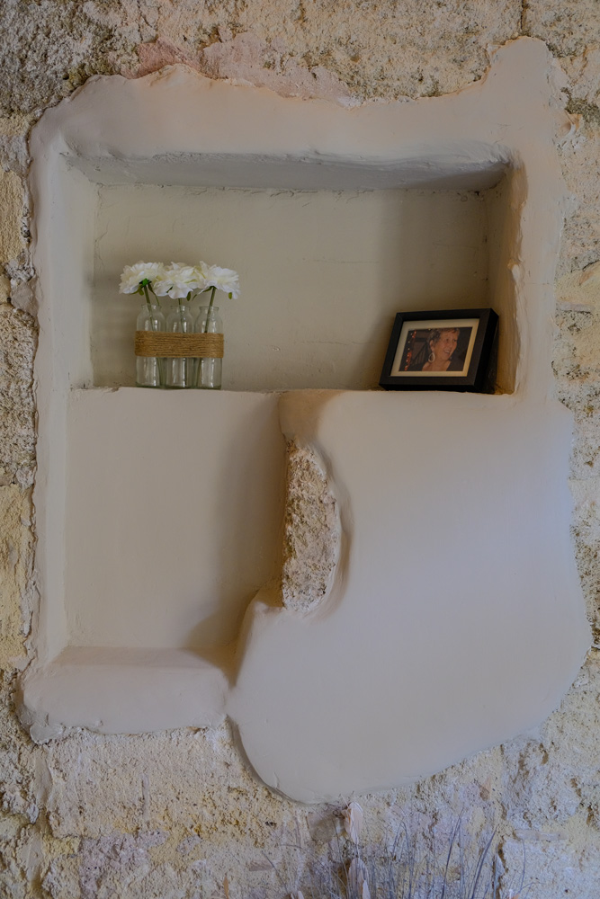 At the time of purchase, this room was resplendent with reams of hanging electrical cables and shredded wallpaper. Our Canadian neighbours Milt & Sharon immediately saw the potential here and set about teaching my Mum and I how to peel back the layers and expose the hidden stones to the former glory. In memory of my Mum’s labour of love, Ian created a dedicated stone shelf niche where her beautiful photo adorns the stone wall.